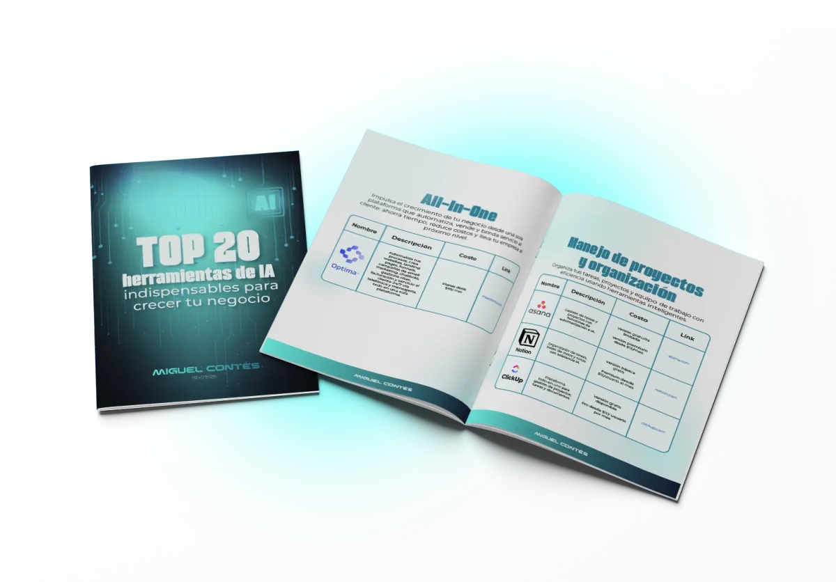Guía GRATIS para emprendedores y profesionales que desean ahorrar tiempo, automatizar tareas y aumentar sus ingresos utilizando inteligencia artificial, sin ser expertos. Encontrarás 20 herramientas Freemium que te ayudarán a trabajar menos y lograr más en claves áreas como: manejos de proyectos, servicio al cliente, automatizaciones, creación de contenido y muchos más.